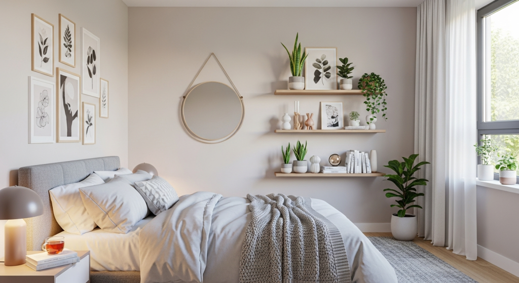 Cermin dinding tidak hanya dekoratif, tapi juga bikin kamar terasa lebih luas dan terang.