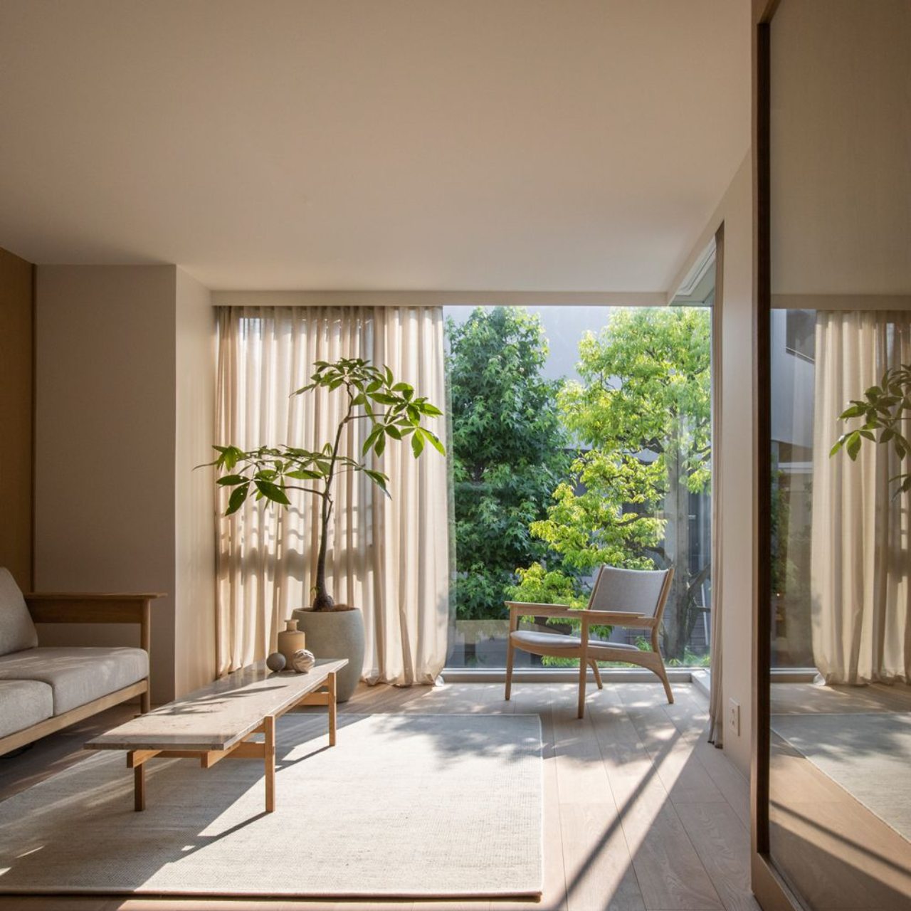 Warna-warna netral, pencahayaan alami, serta penggunaan furnitur rendah menjadi ciri khas yang membuatnya terasa lapang dan nyaman.