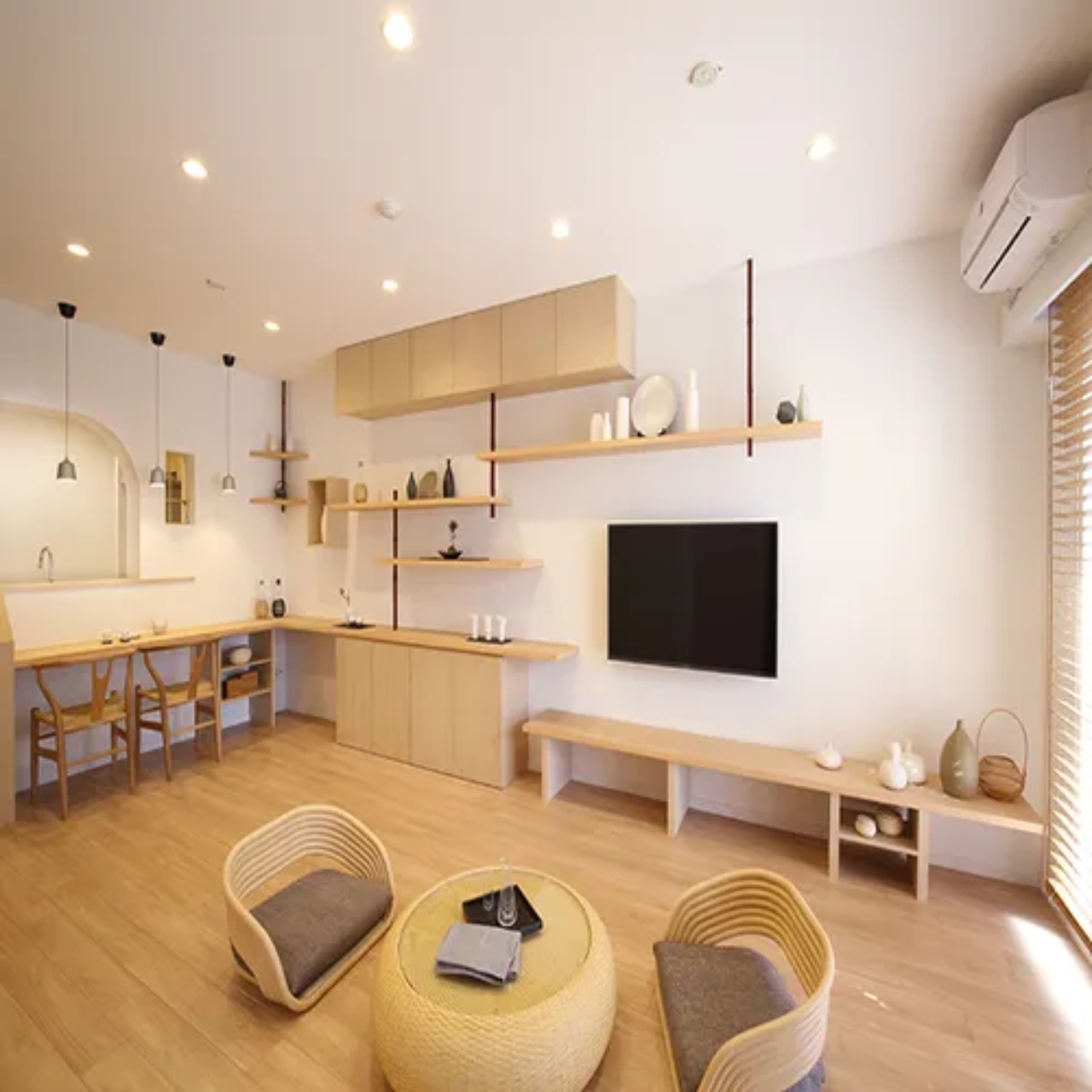 Desain ruang tamu ala Jepang ini menonjolkan Prototipe open space yang menyatukan dapur, ruang makan, dan ruang tamu Untuk satu area.
