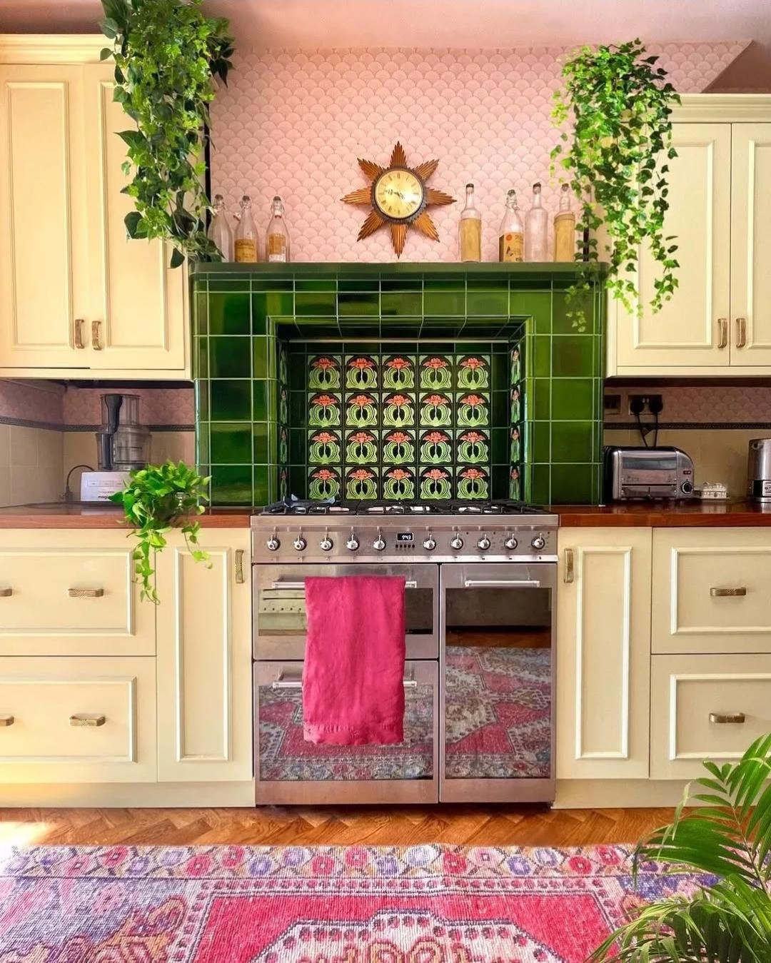 Desain dapur yang lucu ini terlihat Bersama kombinasi warna hijau Di keramik backsplash dan dinding pink bermotif sisik ikan.