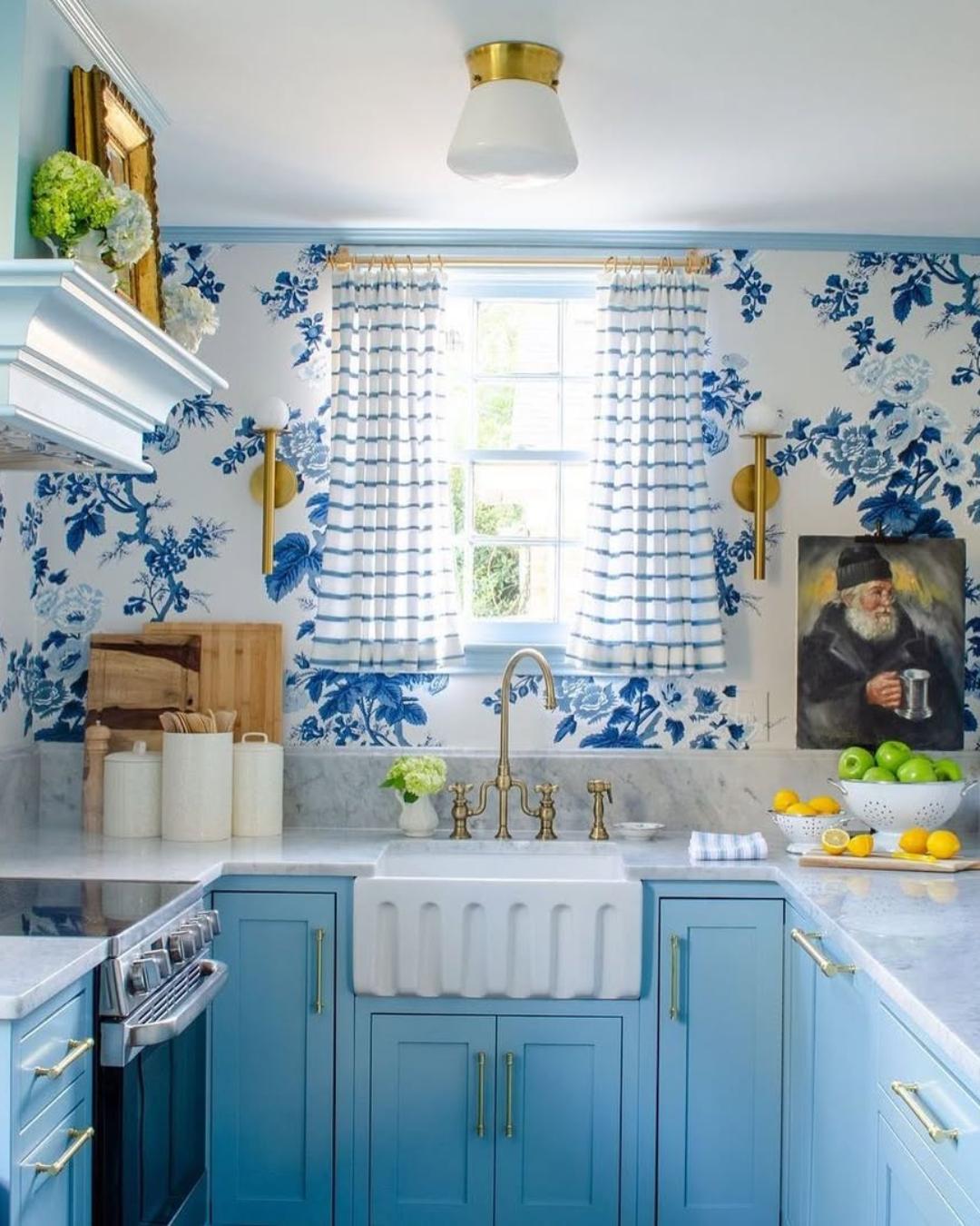 Inspirasi ini Memperkenalkan dapur Bersama nuansa biru pastel Di Pembantu Presiden Pembantu Presiden Pembantu Presiden yang dipadukan Bersama backsplash marmer.