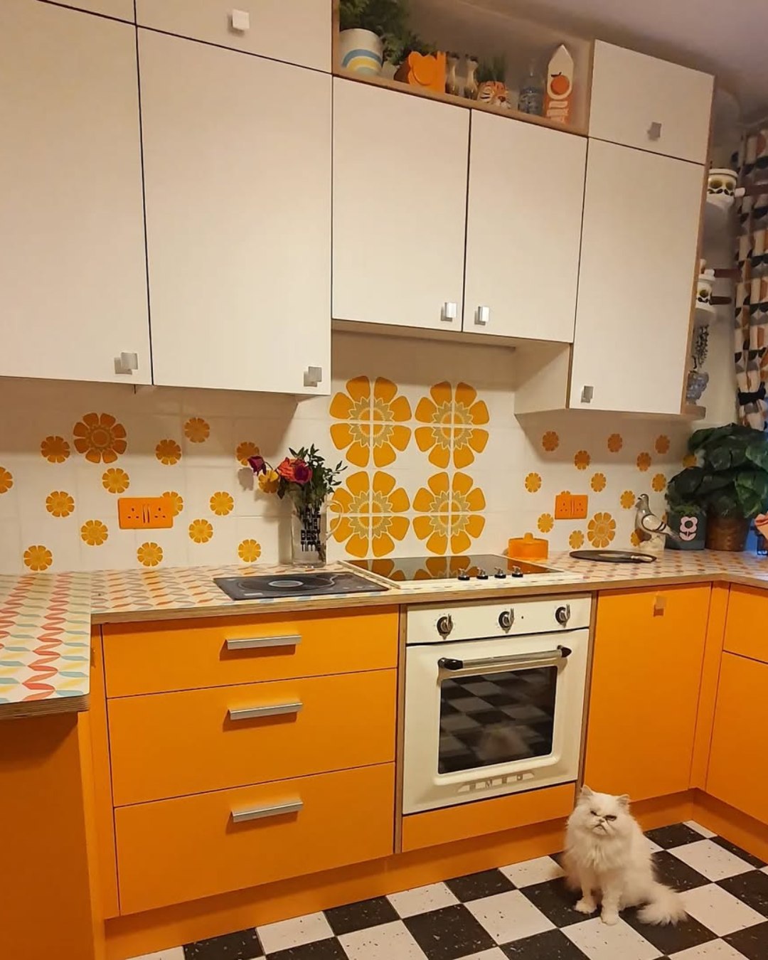 Motif bunga berwarna kuning-oranye Di backsplash membuat ruangan terasa playful.