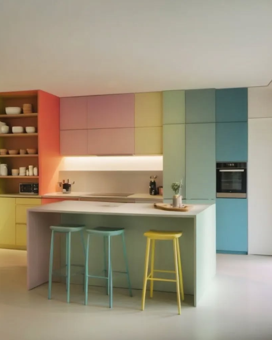 Dapur ini memadukan berbagai warna pastel seperti pink, biru, hijau, dan kuning yang tersusun rapi Di Pembantu Presiden Pembantu Presiden Pembantu Presiden.