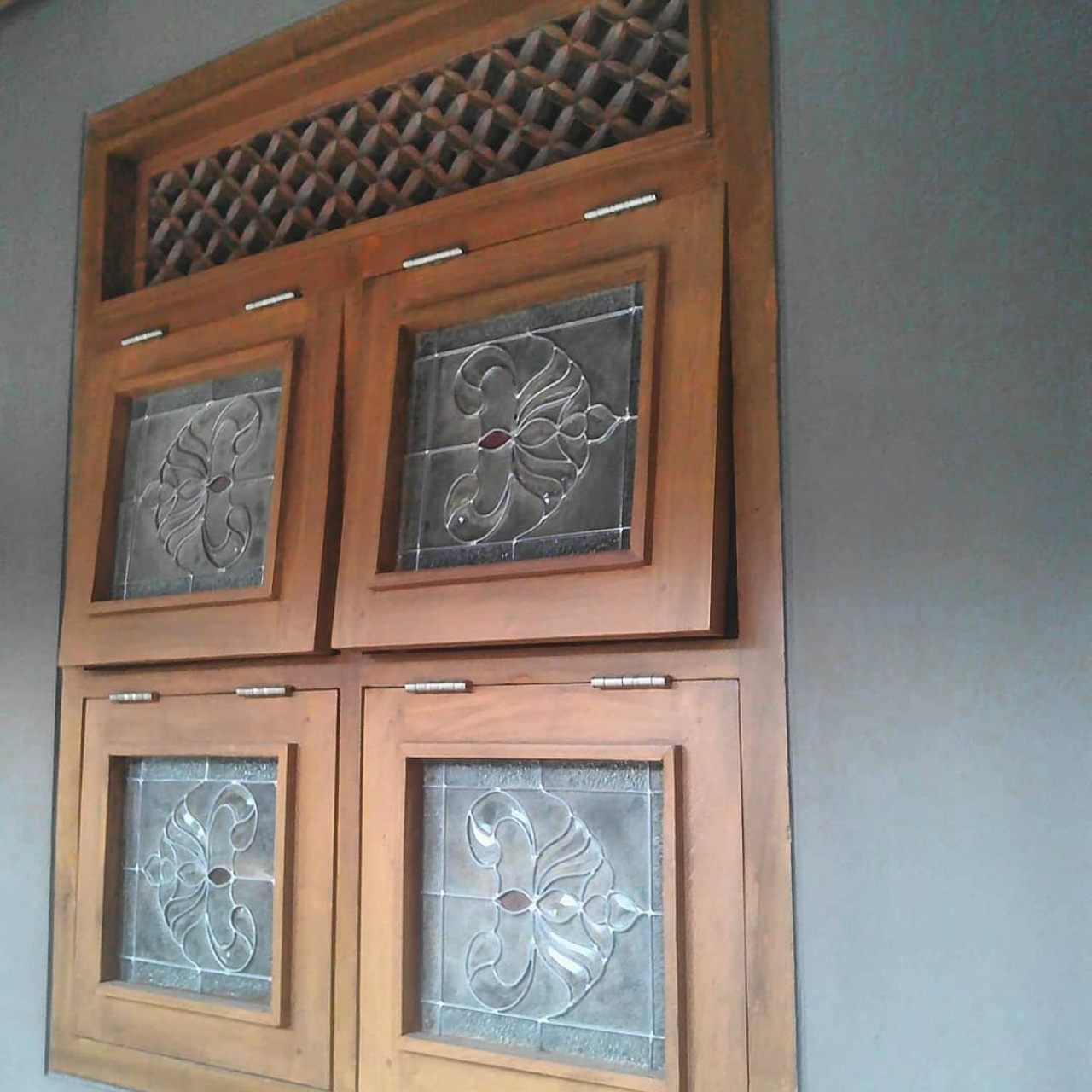 Rangka kayu Didalam kaca patri bermotif menghasilkan kesan klasik yang indah.
