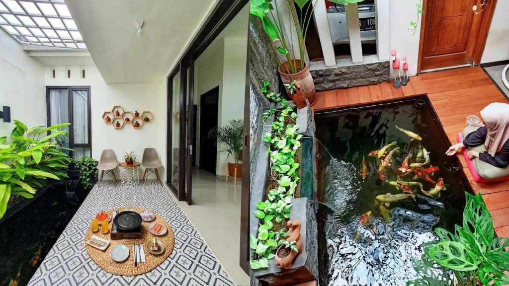 Penataan pot Di tepi kolam memberi kesan modern sekaligus alami, Sambil Itu daun-daun yang rimbun menambah sentuhan tropis Di area tersebut.