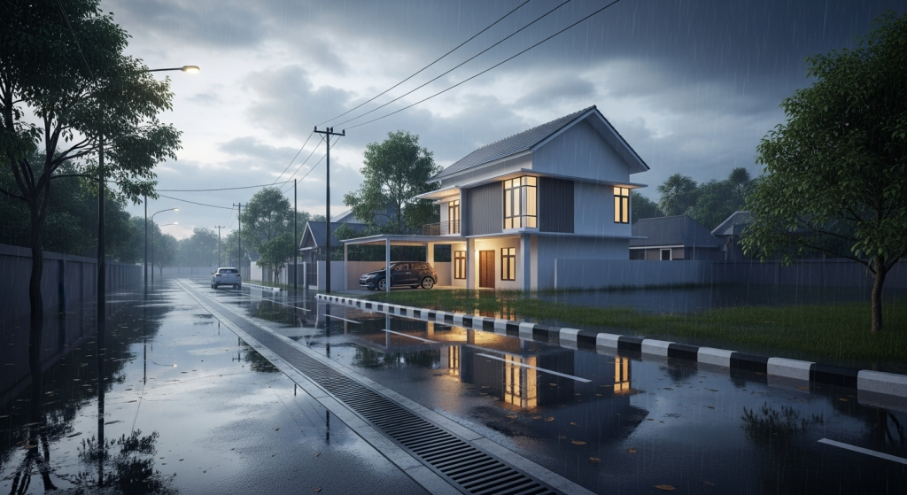Selain meninggikan ketinggian Rumah, Dibagian drainase juga bisa menjadi elemen penting Untuk menciptakan desain Rumah bebas Bencana Alam.