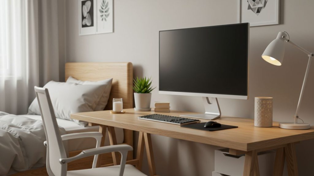 Sebagai tips, kamu bisa menambahkan lampu kecil agar area kerja terasa lebih fokus.