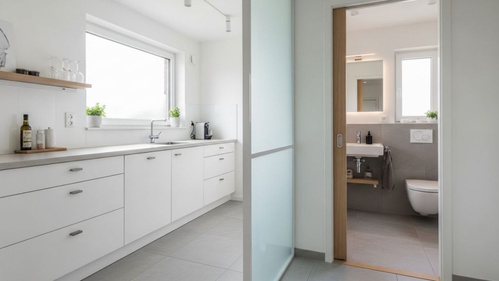 3. Desain Dapur dan Kamar Mandi dengan Pintu Geser Kayu