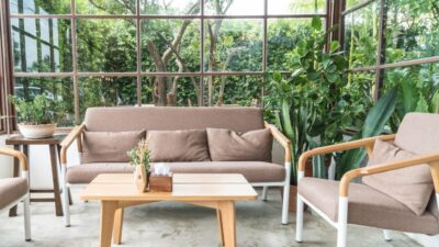 Anda bisa menempatkan cermin besar berlawanan Bersama sofa Supaya menciptakan ilusi ruangan yang lebih luas.