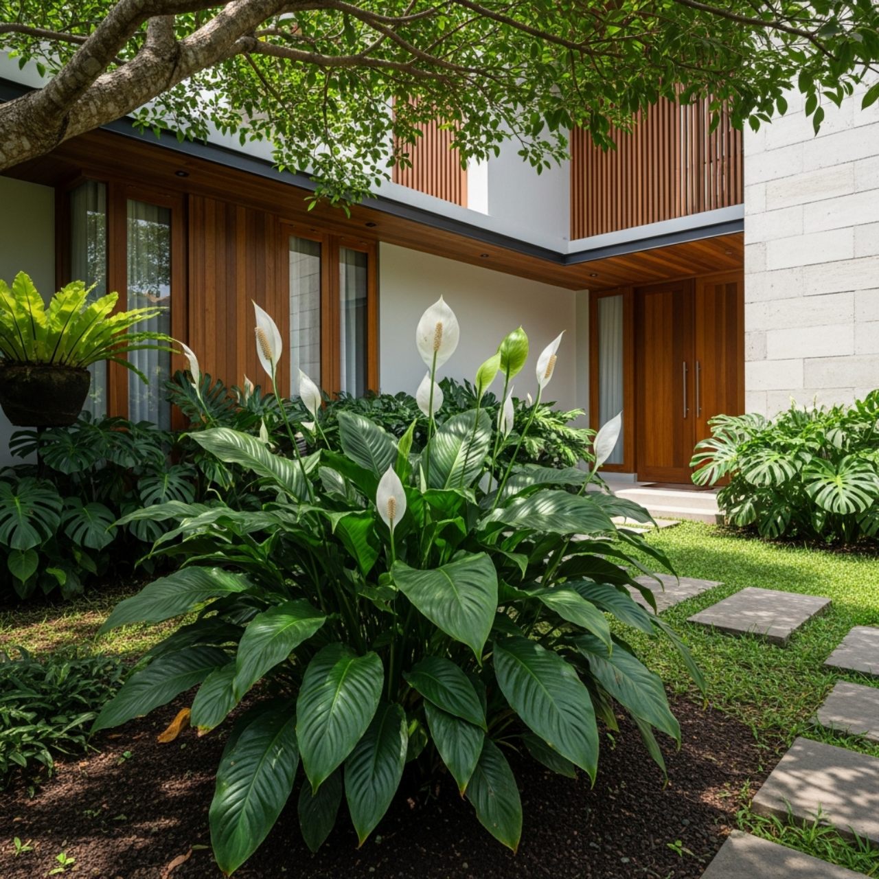Peace lily dikenal sebagai tanaman indoor Bersama bunga warna putih yang tampak bersih dan modern.